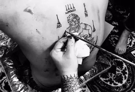 一位男士正在一针一针的刺上 猴神「哈努曼」符案