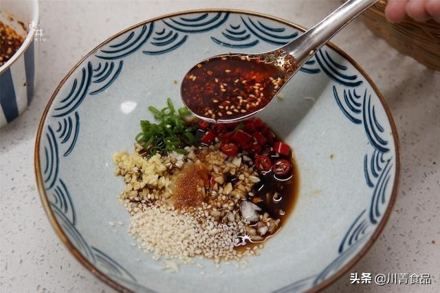 将葱姜蒜切成末,小米椒剁细,加入生抽、醋、盐,提鲜的白糖,和家中熟好的辣椒油,搅拌均匀备用。