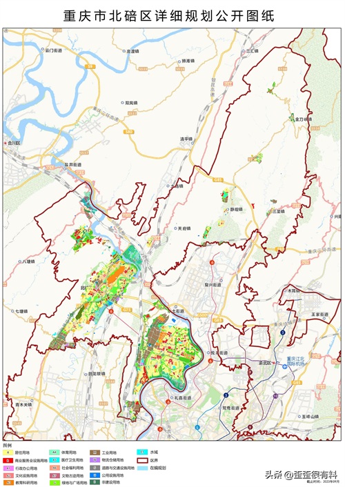 北碚区土地规划图,全域面积区755平方公里,城镇化率达88%,城市规划主要在北碚老城中心以及蔡家板块;
