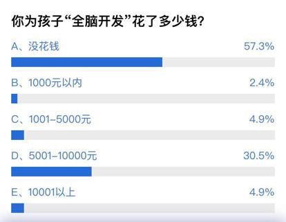 据了解,“全脑开发”培训收费动辄数万元。调查显示,57.3%网友没有为全脑开发花过钱,30.5%的网友花费在5001-10000之间,4.9%花费在一万元以上。有网友戏称:“给孩子‘全脑开发’的钱属于家长的智商税,也算给自己开发了,不亏。”