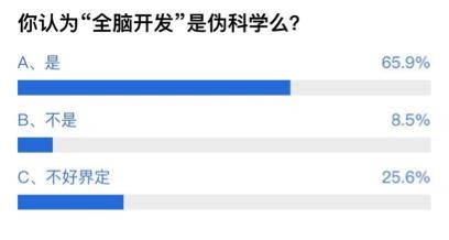 “全脑开发”是伪科学吗?65.9%的网友认为是伪科学,仅有8.5%网友持反对意见。网友“瑞思拜33”称:“这种伪科学也有人信?骗来骗去就是骗自己。”但是问卷调查也显示,超过一半的网友表示,身边有送孩子去“全脑开发”之类机构的事例发生。