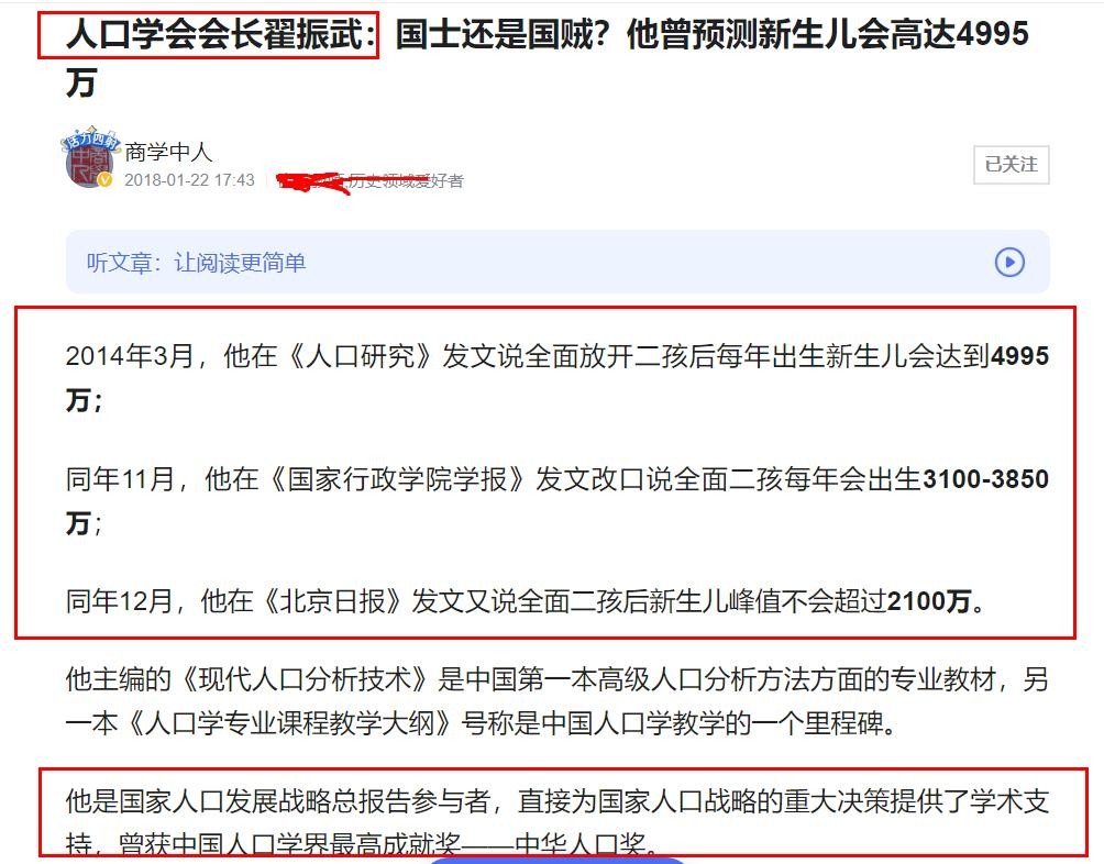 非常离谱:2014年3月,翟振武发文说全面放开二孩后每年出生新生儿会达到4995万;同年11月,在他的另一篇文章里这个新生儿数字变成了3100-3850万;12月,在又一篇文章里变成了新生儿峰值不会超过2100万。