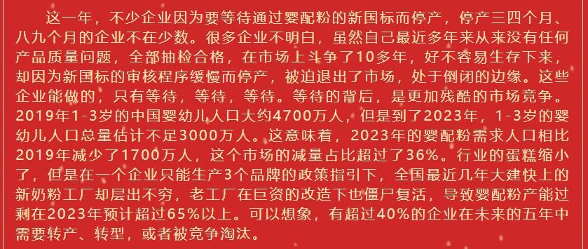 这一年,不少婴配粉企业处于崩溃的边缘,有超过20%的企业还处于停产状态;这一年,无数企业裁员,综合裁员人数超过15%;这一年,超过85%的企业要么销量下滑、要么利润下滑;这一年,有20%的企业因为业绩下滑原因换帅、换将,甚至有的企业更换了董事长……