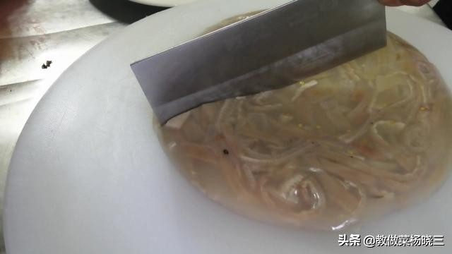 猪毛刮干净,剃完油之后把猪肉皮切成筷子,那么宽的丝就可以 。切好之后,咱们起锅烧水,先把猪肉皮用热水焯一下 ,这样做出来的皮冻会更干净一些。焯好后用清水洗净 。