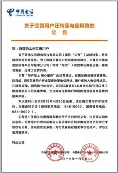公告如下:鉴于云南艾普通信科技有限公司(以下简称艾普)战略转型,暂停提供宽带业务服务。为了保障艾普宽带服务的稳定,艾普与中国电信股份有限公司昆明分公司(以下简称电信)就宽带业务的运营稳定与发展达成的合作共识。本着用户至上,用心服务的经营理念,经报云南省通信管理局,即日起,云南艾普用户将全面迁转至电信网络。用户迁转入电信网络后,在服务延续,网络提升的同时,还可以享受到4k高清电视节目以及不限流量手机卡的多重优惠,充分保障迁转用户持续的通信服务及更优的服务体验。