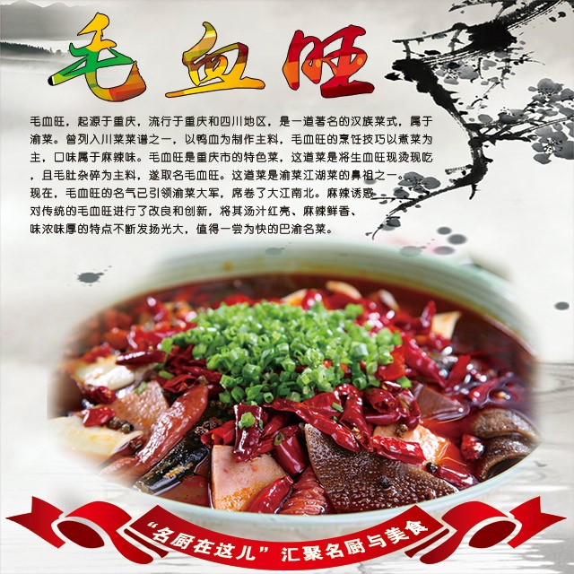 “毛血旺是四川重庆的特色菜。口味麻辣鲜香,汤汁红亮,味浓味厚。”