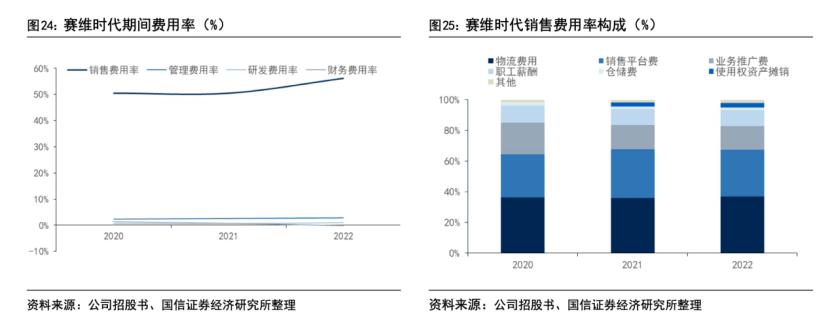 赛维时代近三年销售费用占营收比例均超 50%。以 2022 年为例,当年营收为 49.09 亿元,销售费用达到 27.58 亿元。其中,物流费用 10.24 亿元、销售平台费 8.40 亿元、业务推广费 4.23 亿元。