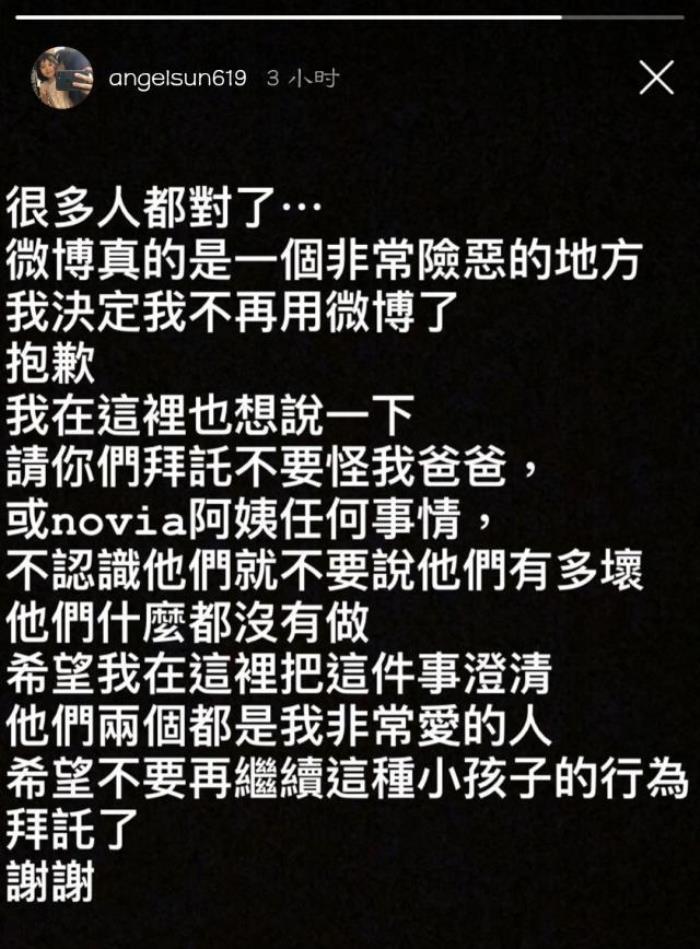 梧桐妹如今长大了,正值豆蔻年华的她也和很多同龄女孩儿一样爱在网上晒一些自拍,爱分享日常生活动态。在美国度假期间,梧桐妹也时不时在自己的Ins上和粉丝们分享美景及休闲的生活。之后开通微博账号后,开心关注了修杰楷、贾静雯、高圆圆等家人,晒出了全家福及自己在美国家中自家泳池的照片,但是没想到的是仅开通5天后,梧桐妹就决定关闭微博了。除此之外,梧桐妹也为自己的爸爸孙志浩和林若亚阿姨进行了澄清,希望大家不要再怪她们。从梧桐妹的字里行间可以看出,她应该是受到了一些网友的网络霸凌。
