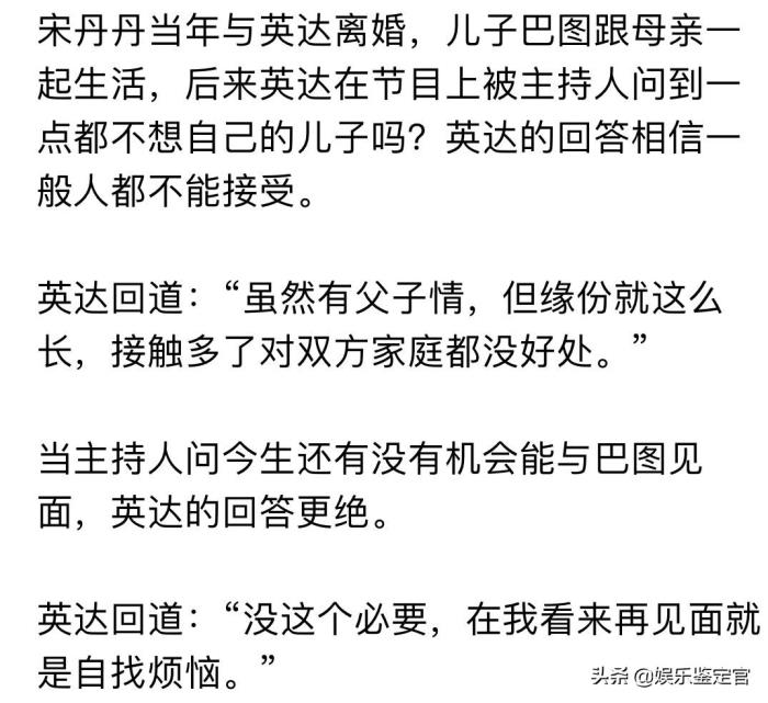作为单亲妈妈,宋丹丹含辛茹苦地将英达养育成人。离婚23年期间,英达对巴图不闻不问,似乎遗忘了自己身为巴图生父的身份。当媒体采访谈及巴图时,英达直言在巴图出生时他不够成熟,无法理解父亲这一词涵盖的责任,而在与宋丹丹分开后,他更是自觉与巴图父子缘尽,没必要再连联系。