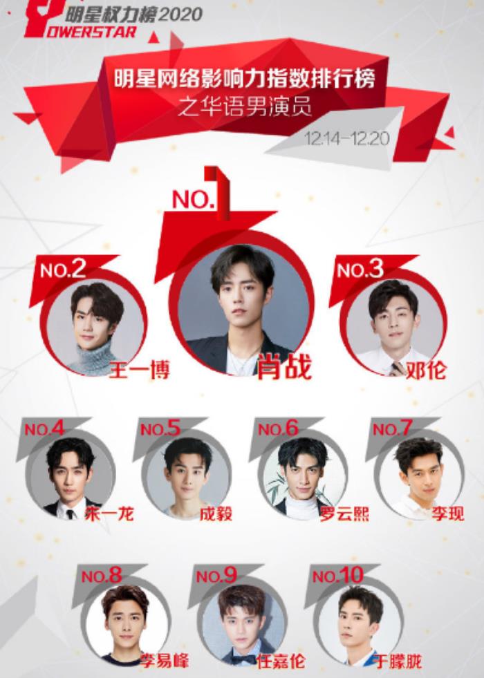 排在榜首肖战和第二名的王一博,都是近年来的90后顶流小鲜肉,肖战的代表作是《陈情令》、《诛仙1》、《狼殿下》,王一博的代表作也是《陈情令》。平心而论,两人的演技真的只能算凑合,但人气是真的高,在各种人气榜单上都能看到他们的名字,而且排名都比较靠前。