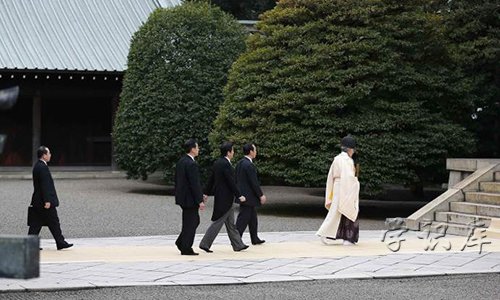 2015年4月21日起,日本靖国神社举行为期三天的例行春季大祭活动。日本首相安倍晋三供奉真榊祭品。