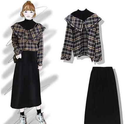 黑色韩版娃娃领复古拼接假两件格纹衬衣+黑色A字中长款半身裙