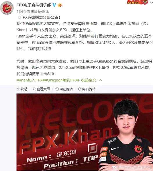 我们很高兴地向大家宣布,经过友好沟通与协商,前LCK上单选手金东河(ID:Khan)以自由人身份加入FPX,担任上单位。