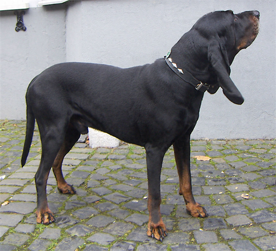 前部笔直,肩部长、倾斜且与背部结合完好。腿笔直且肌肉发达,脚腕垂直且有力。足爪小、圆,呈猫足。脚垫厚实,黑色。趾甲结实、黑色。后躯结实而肌肉发达,第二节大腿发达且后膝关节适度弯曲。飞节适度垂直,彼此平行且从结合处到地面的距离短。步态行进是笔直的、自由而轻松的,前躯伸展自如,后躯驱动力强大,当步伐加快时,足爪自然的向中心线靠拢。