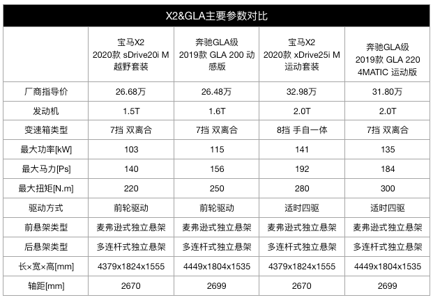 国产宝马X同样搭载1.5T直列三缸发动机和2.0T直列四缸发动机,最大输出三缸机和GLA更大牌量机型略有差距,四缸机和GLA相当。传动系统方面,根据车型不同,X2配备7速双离合变速箱与8速手自一体变速箱,部分车型还配备xDrive四驱系统。