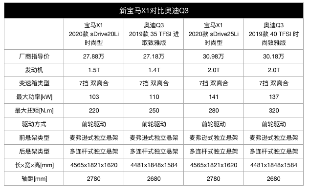 新宝马X1最直接竞争对手,自然是奥迪Q3。因为X1是基于UKL前驱平台来的,所以底盘布局和Q3差不多,俩车动力参数也非常接近。区别在于两点,一是新X1的1.5T是三缸机,部分消费者可能会介意;二是X1轴距远超过Q3,空间表现尤其是后排,可以说完胜对手。