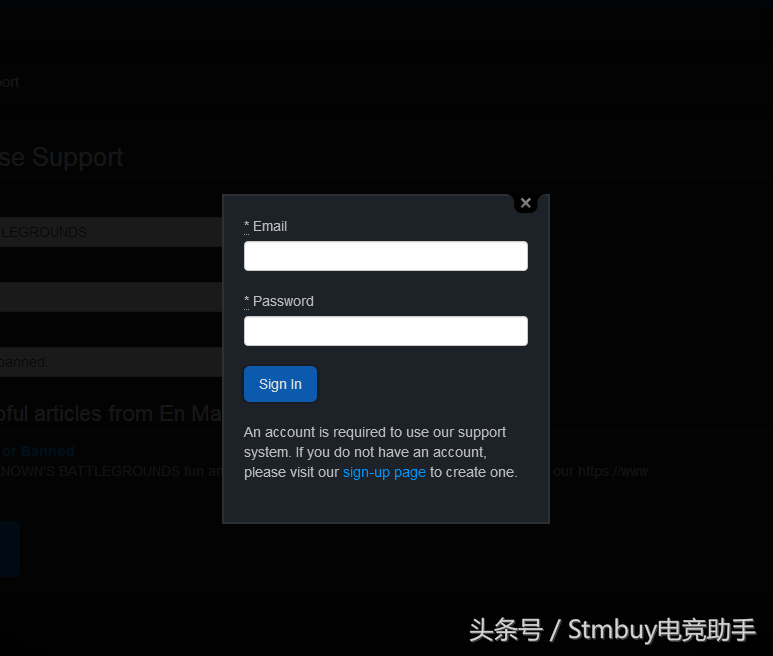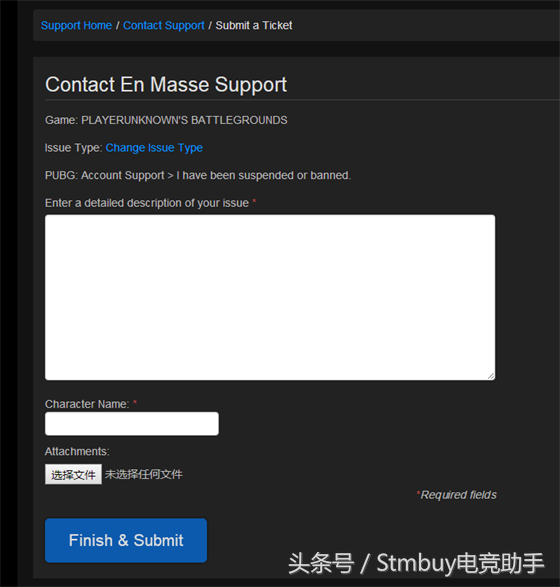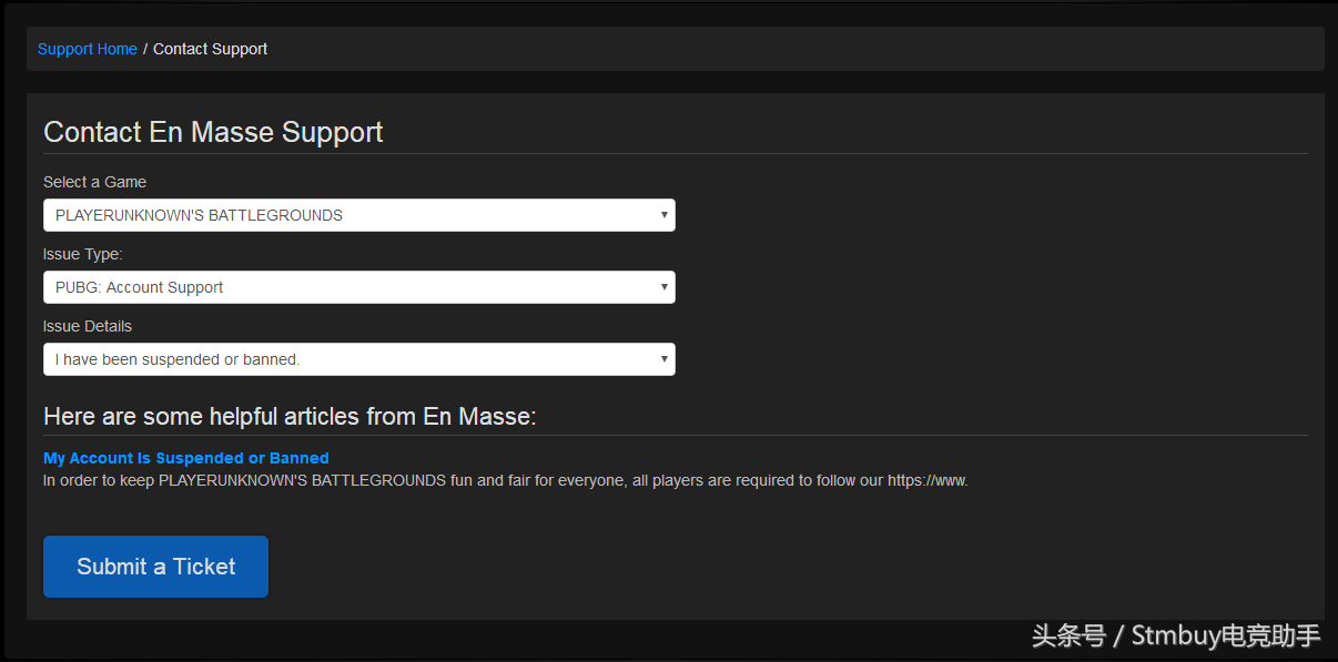 接下来依次选PLAYERUNKNOWN'S BATTLEGROUNDS——PUBG:AccountSupport——I have been suspended or banned选择完毕之后点击Submit aTicket,然后登陆刚注册的邮箱进入。