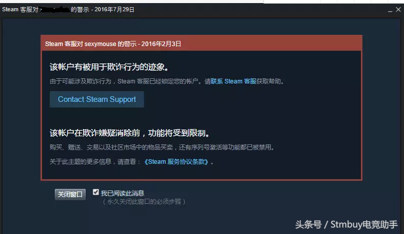 首先大家要知道一般Steam发送封禁邮件一般有两种:红信和黄信,收到红信表示你已经违反了Steam各种用户协议,对你进行封禁或惩处措施。如买了黑KEY,黑卡购物,代理购入低价区产品会封禁账号几天,之后所涉及的游戏或产品会被移除,而社区市场交易涉及欺诈的,可能会永久封禁你不能进入社区市场的权力。遇到这种情况基本上是无解的,就算你向Steam官方发邮件申请解封也没有用。