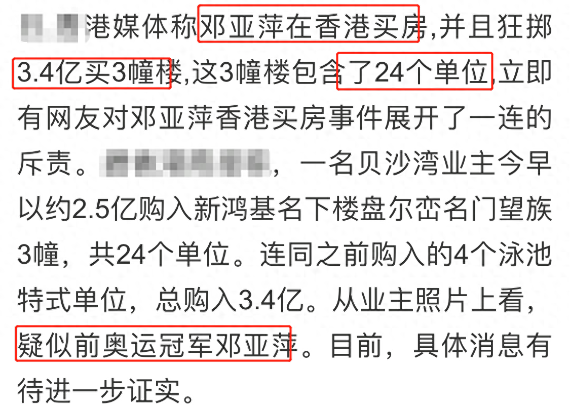 其实,作为顶尖的奥运明星,邓亚萍奋斗多年积攒了不少财富,邓亚萍曾被曝花费3.4亿在中国香港购置了3栋大楼,不过对于此类新闻,邓亚萍也没有正面回应过,真真假假我们也无从定论。