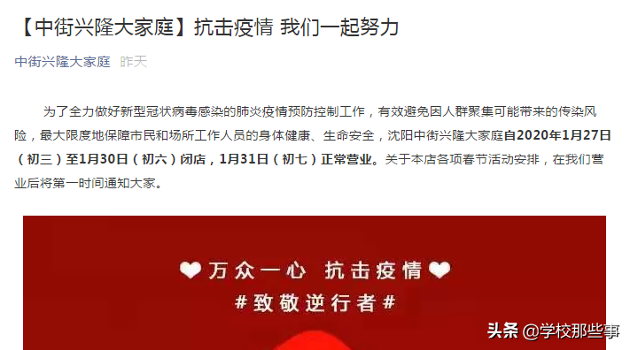 沈阳中街兴隆大家庭自2020年1月27日(初三)至1月30日(初六)闭店,1月31日(初七)正常营业。(这个比较狠,直接闭店几天)