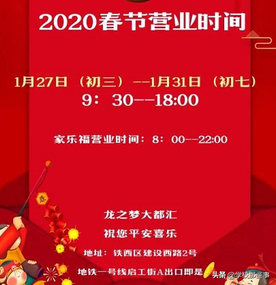 1月28日-2月2日(初四至初九)营业时间:10:00-18:00(家乐福,麦当劳,肯德基,必胜客以店内通知为准)