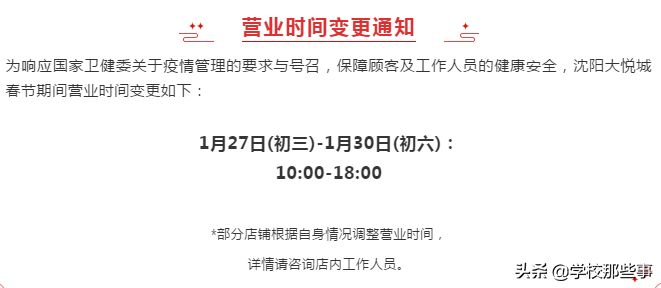 为切实做好当前新型冠状病毒感染的肺炎疫情防控工作,沈阳百联春节期间营业时间临时调整为: