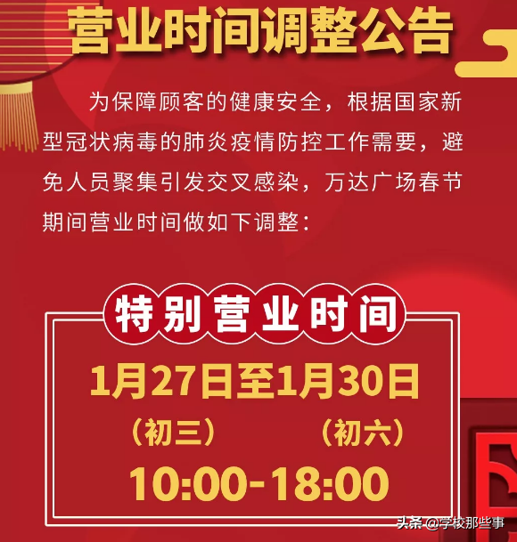 结合当下疫情及一方广场的实际情况,特对春节期间营业时间做出如下调整:2020年1月28日至30日(正月初四至初六)营业时间为10:00-18:00