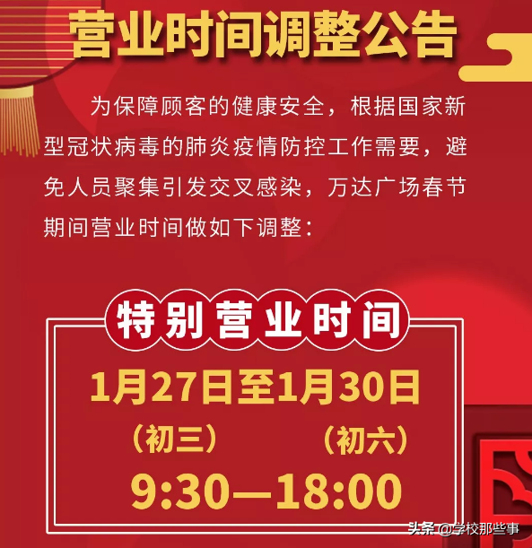 太原街万达广场营业时间调整通知,1月27日至1月30日,营业时间:9:30—18:00
