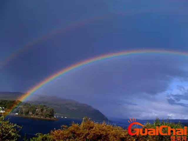 如果空气干燥,或者天空中只有微小的水滴,那就不会形成彩虹。一般来说,水滴越大,虹带越窄,色彩越鲜明;反之,水滴越小,虹带越宽,色彩就暗淡。有时,我们可以看到天空有两条彩虹:一条叫主虹,色彩鲜艳,里面是紫色,外面是红色;另一条叫副虹(又叫霓),里面是红色,外面是紫色,虹色较淡。这种现象是由于阳光透过水滴时,发生两次折射和反射的缘故。