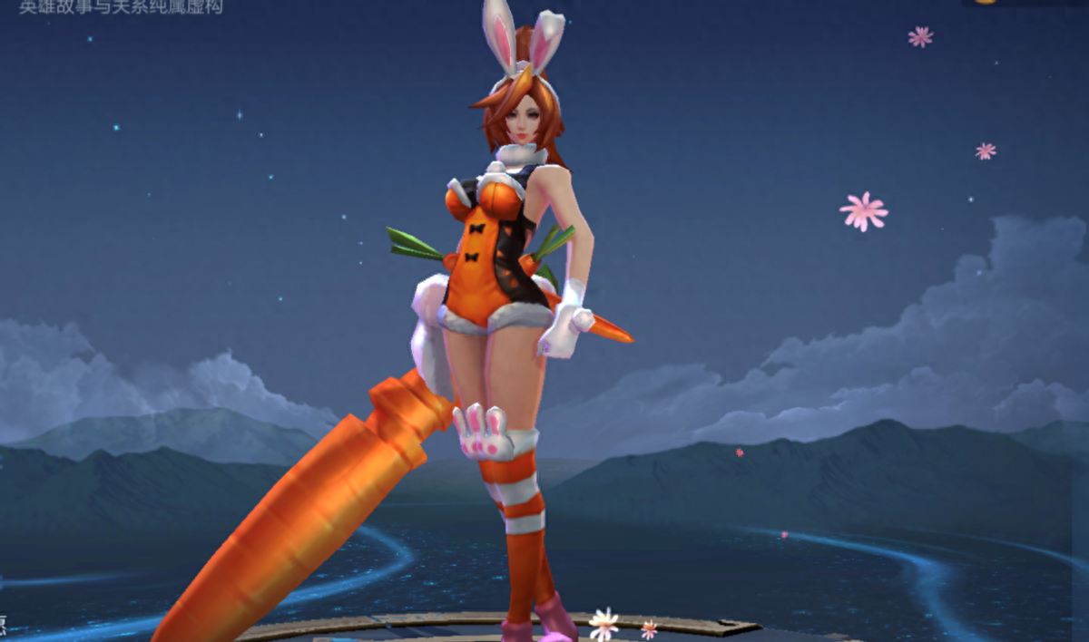这款皮肤将花木兰的武器,改成了胡萝卜,趣味性十足,在游戏中除了有胡萝卜还有小白花特效,虽然感觉技能很连贯身法飘逸,但总感觉用起来很轻,希望后续有机会能等个优化。