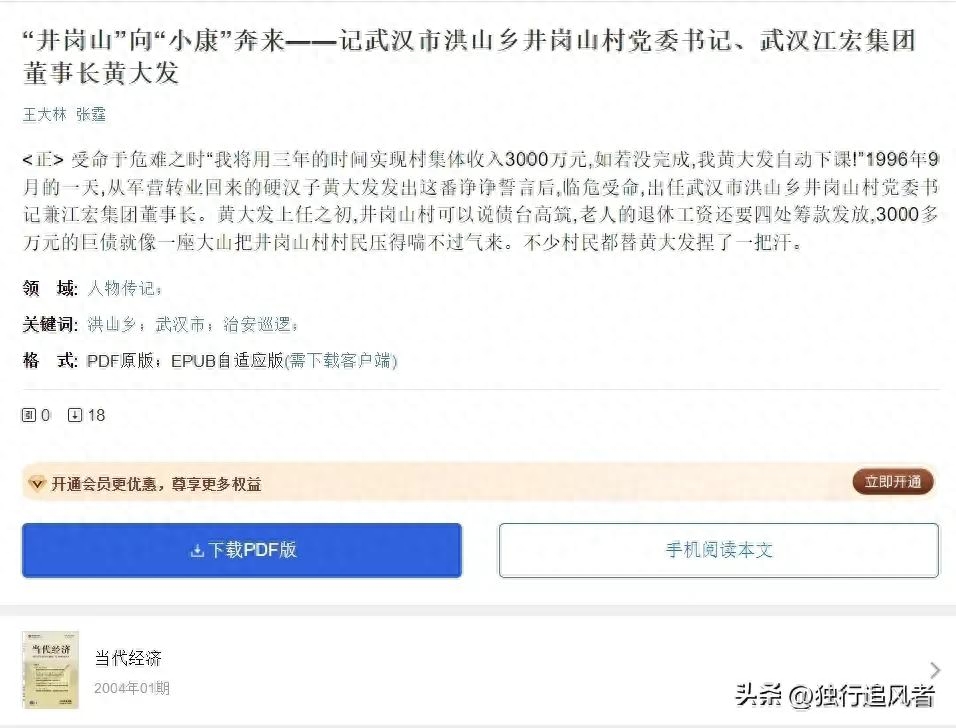 黄大发,男,1961年生,武汉人。1996年他从部队转业并出任洪山乡井冈山村党委书记兼江宏集团董事长,上任第一天对外发誓:“用3年时间实现村集体收入3000万元,如未能完成任务,自动下课”。