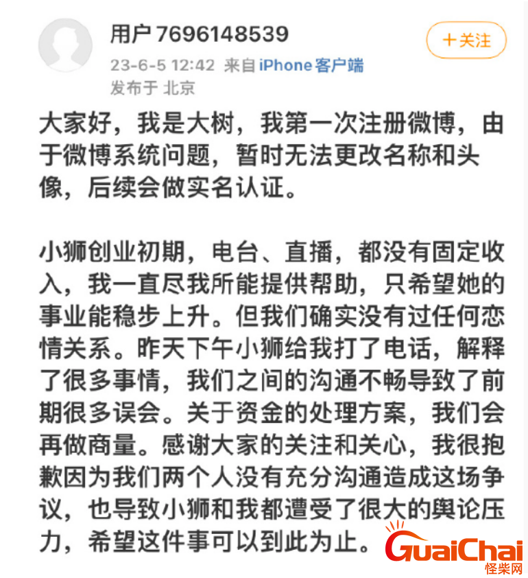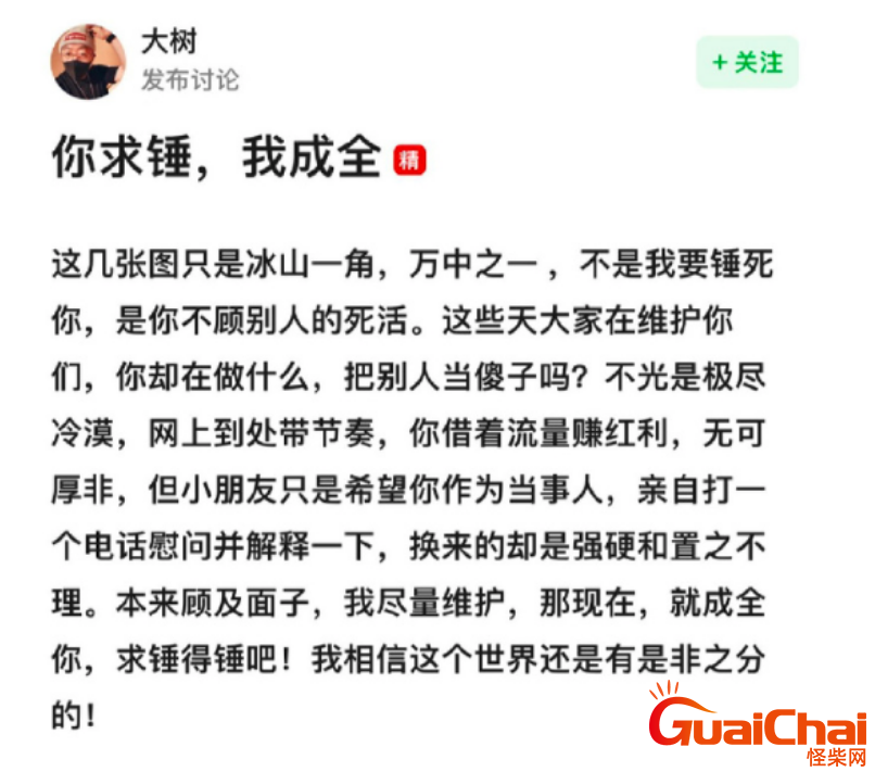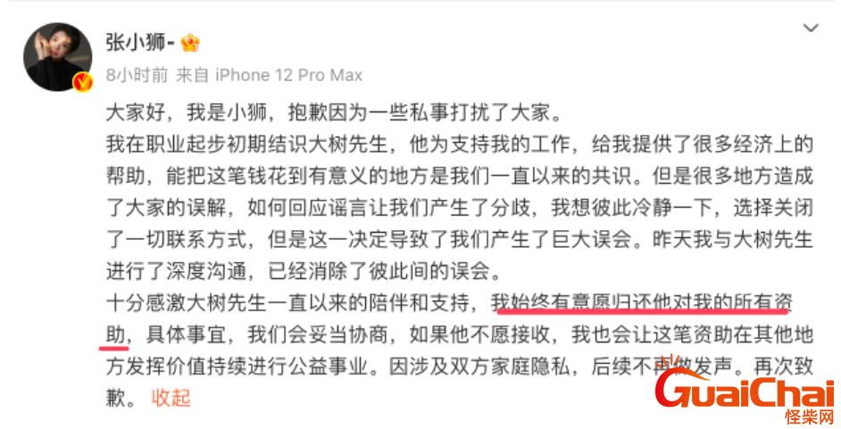 这个“榜一大哥”叫“大树”,2019年跟张小狮认识的。已知这个大树是一个年龄40+的大叔,离异有一娃,目前身患癌症,时日无多。前几天,这个大树因爱生恨,跑出来锤张小狮,私底下收了他巨额转债,金额高达2000万。