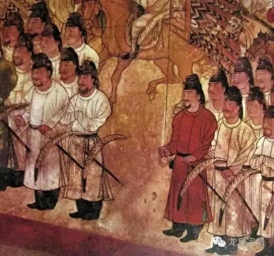 唐长乐公主壁画,武士腰间的唐仪刀就是环首刀。另一把为无柄的陌刀?有待考证。