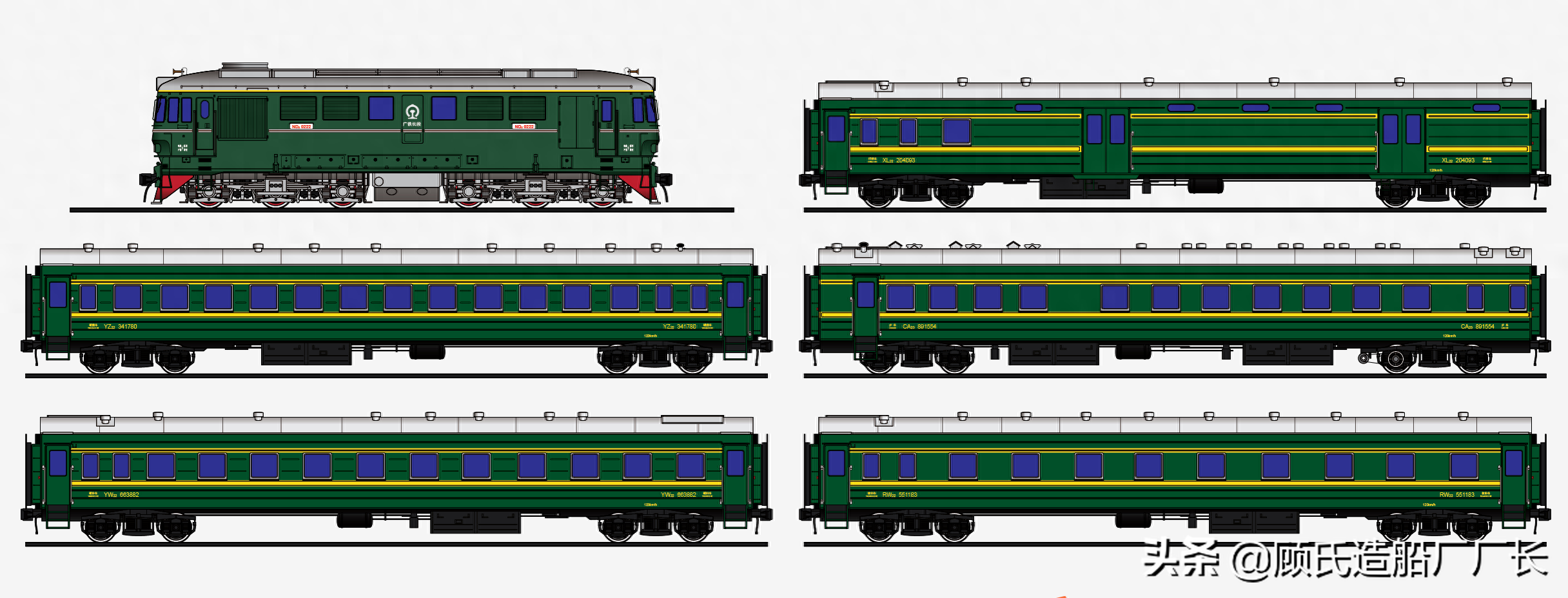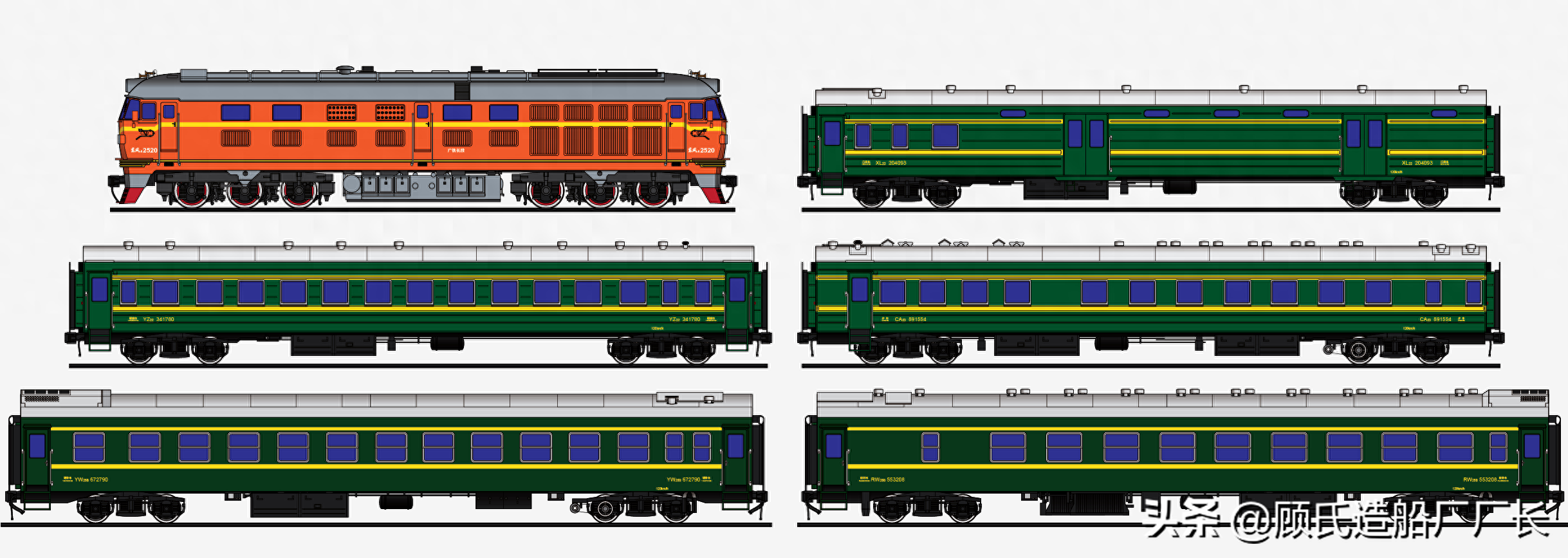 本厂长绘制的324次列车本务机车和编组车厢等比例侧视图