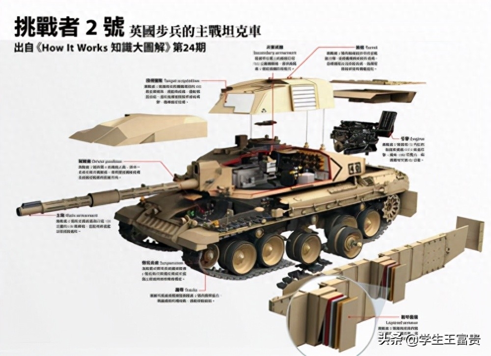 挑战者2主战坦克为英国公司阿尔维斯·维克斯所生产的一款主战坦克,它是挑战者系列的第三种车型,于1993年开始生产,挑战者2的炮塔防护采用的是第二代“乔巴姆”复合装甲。炮塔中还装有一套核生化防护系统。装备有BAE系统公司的L30型120毫米线膛坦克炮,可携带50发120毫米炮弹,包括尾翼稳定脱壳穿甲弹;配备全电式火炮控制和稳定系统,火控及观察系统,是世界上防护力最好的坦克之一;还装备有7.62毫米链式机枪;最大公路速度为59公里/小时,行程为450千米。