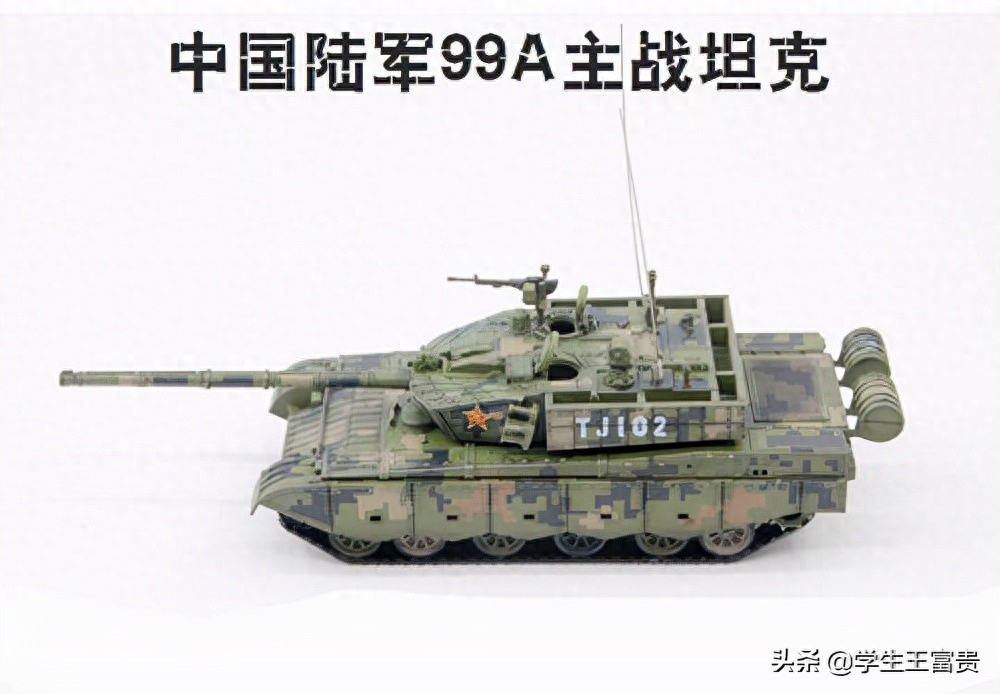 99A式坦克是我军最先进且完全信息化的主战坦克,实现了火力、机动力、防护力和信息力的有效融合,体现了陆战装备的新水平,是我国真正意义上的首台信息化坦克。99A坦克主要用于压制、消灭反坦克武器,摧毁野战和坚固防御工事,歼灭敌有生力量。99A坦克仍采用125毫米主炮,但性能有极大提升,其三期尾翼稳定脱壳穿甲弹可在2000米距离上击穿700毫米厚的均质钢装甲,三期弹改可达950至990毫米之间;其正面车体实际装甲物理厚度(LOS)超过1000毫米,可以承受全球现役任何一款主战坦克的主炮首发射击;其最大公路速度达到75公里/小时。