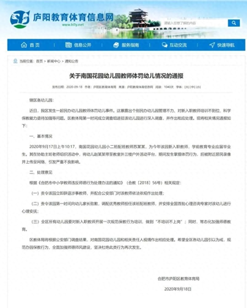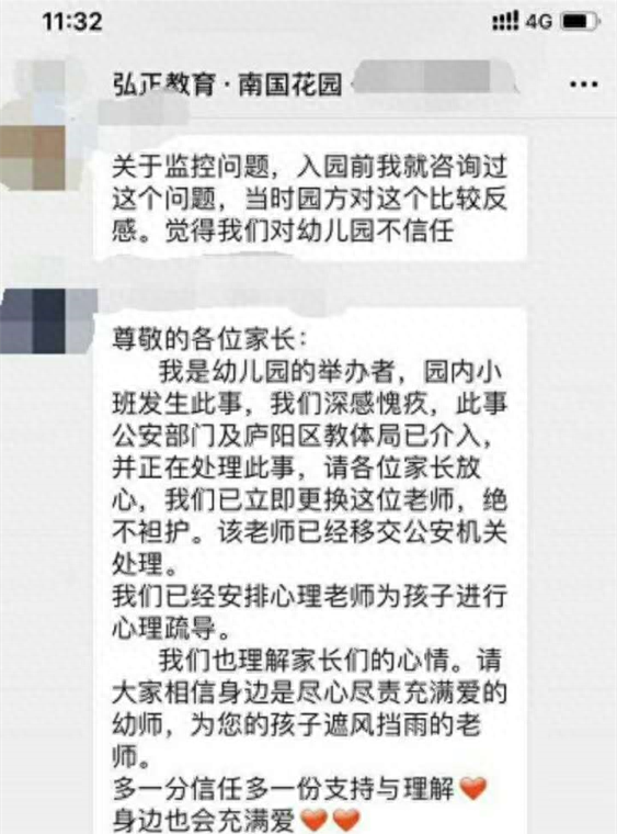 事情曝光后,该区教体局成立调查组进驻涉事幼儿园进行深入调查,于第二天在官方发布通报:责令该园立即辞退涉事教师,该园第一时间向幼儿家长致歉。