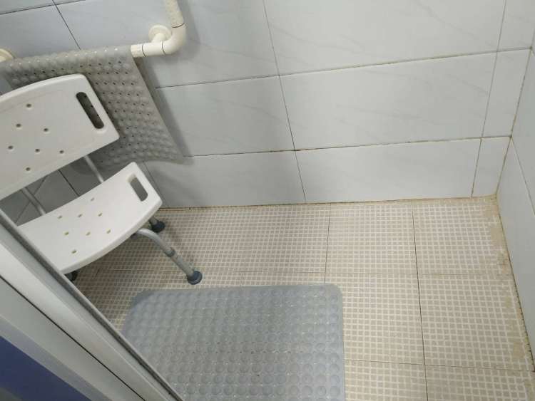 再往里就是洗浴间,推开玻璃门,能看到一块长方形的洗浴空间,地方不大,适合一人站立,墙上安装有淋浴喷头、金属置物架、安全扶手,墙边放着一把助浴椅,地上铺着防滑毯。相比之下,家庭助浴室的洗浴空间面积更大一些,可容纳两三个人站立或坐下,其他配置和普通浴室一样。