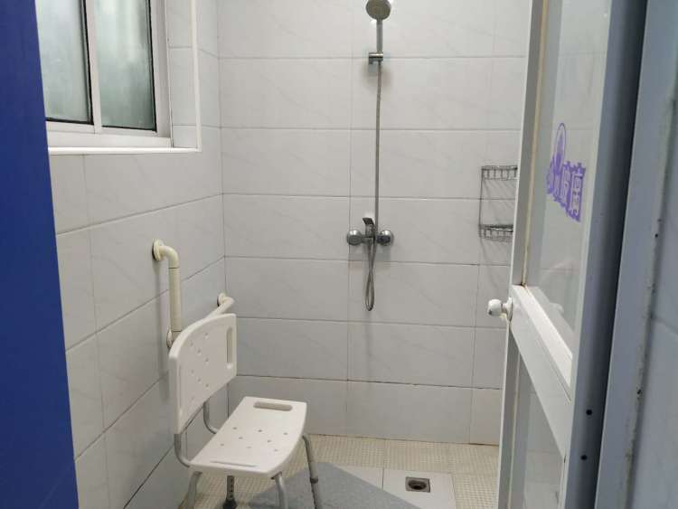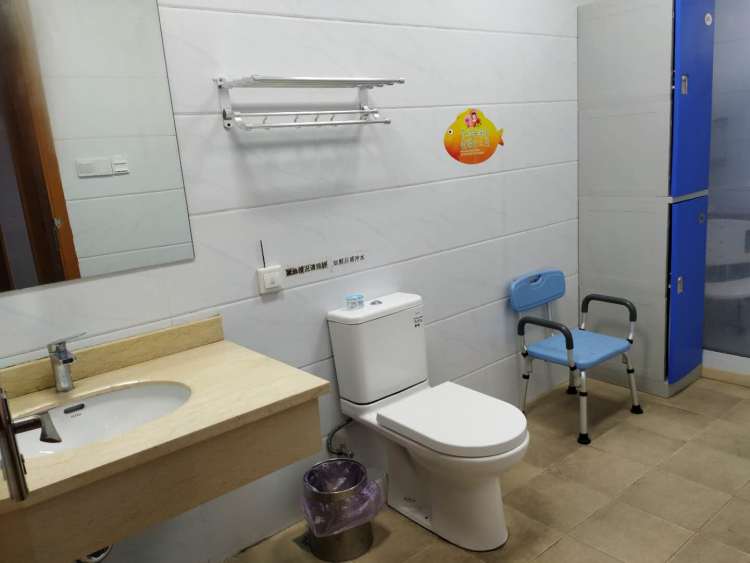 过了一会儿,有居民洗完澡出来,周到君走进浴室参观。普通助浴间看起来挺宽敞,进门处是洗漱台,上面悬了一面衣冠镜。边上有个坐便器,靠墙处装了紧急呼叫铃。墙角有一台带锁的蓝色置物柜,一把带扶手的靠背座椅,墙上装着毛巾架。