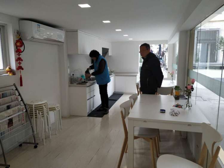 设在弄堂干道边的“共享客厅”,灶台、桌椅整洁如新,看起来维护得很好。负责管理的志愿者告诉周到君,这里逢工作日每天开放,双休日向有预约的居民开放。居民可以借用这里的场地用餐、烹饪,每场限租3小时,费用为80元,超时后每小时30元。