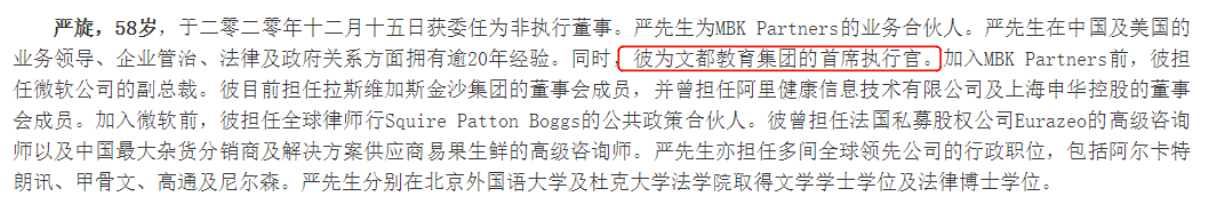 财经网在神州租车官网上发现,高管介绍中,严旋于2020年12月15日担任了神州租车的非执行董事,有20多年法律方面且“彼为文都教育集团的首席执行官”的经验。