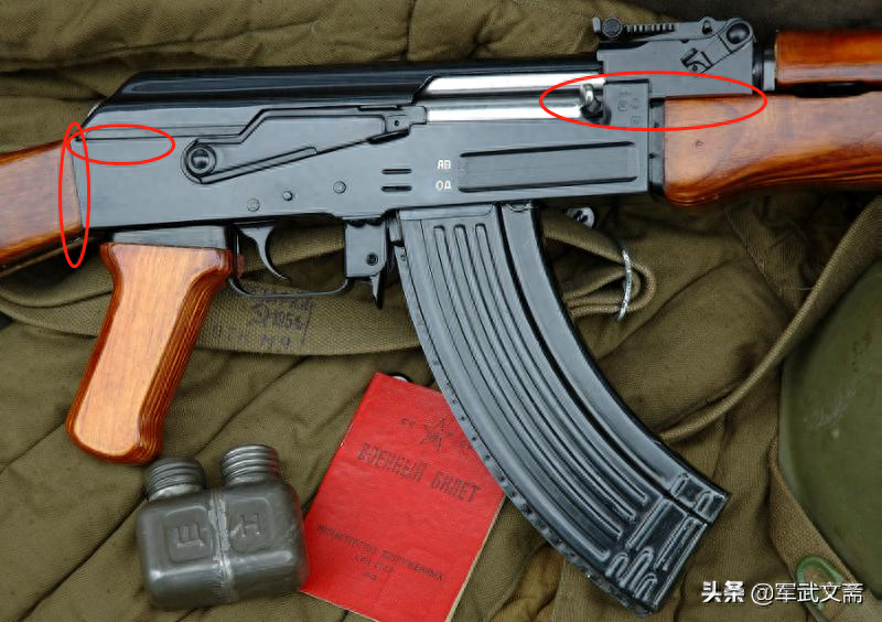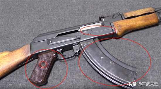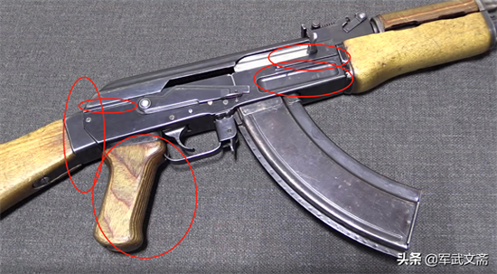 上面这些是AKM比较明显的特点,明显的就是铆钉、机匣盖上的加强筋护木上的手指槽,塑料握把等,剩下一下像导气箍、准星等细微部件都是有一部分的改变。