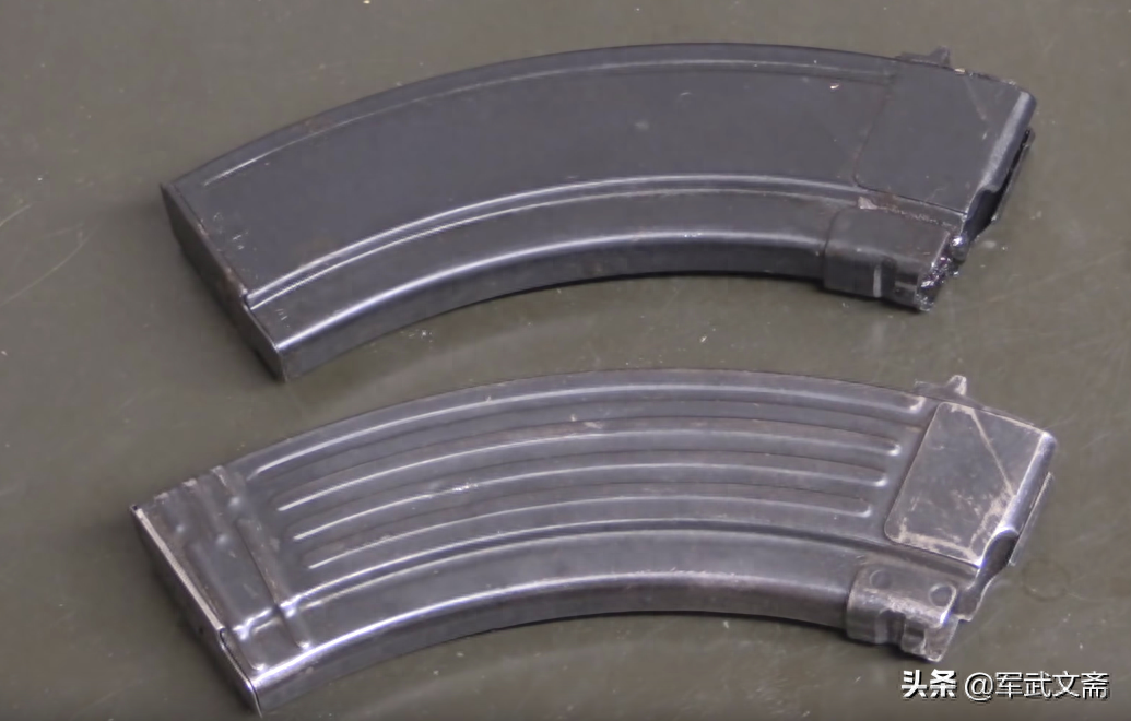 而且,其弹匣也是换成了冲压金属加上加强筋的那种弹匣了,这种弹匣咱们是比较熟悉的,五六冲的那个弹匣,但我估计人们见过最多的应该是电视剧里那个带着弧形弹匣的捷克式机枪的弹匣,那款捷克式机枪就是后来改了膛之后,换了M43弹的轻机枪,抗战时期没有。而那种钢制弹匣和这种弹匣其实是可以通用的,看到用钢弹匣的AK-47Ⅲ型也不算奇怪。