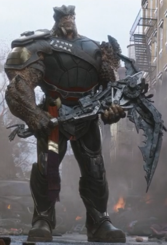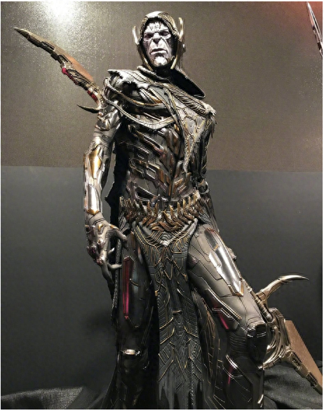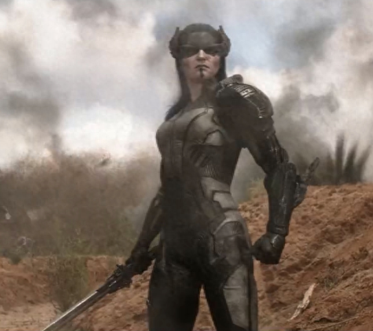 亡刃将军 —— 外星人,灭霸手下第一大将,黑曜五将之首,与暗夜比邻星是情侣,在《复联3》抢夺幻视头上的心灵宝石时被赶来的美国队长、黑寡妇和猎鹰击伤而退,后又在追击幻视时被美国队长阻挠,将要杀死美国队长时被幻视从背后用自己的武器捅死。↓↓↓