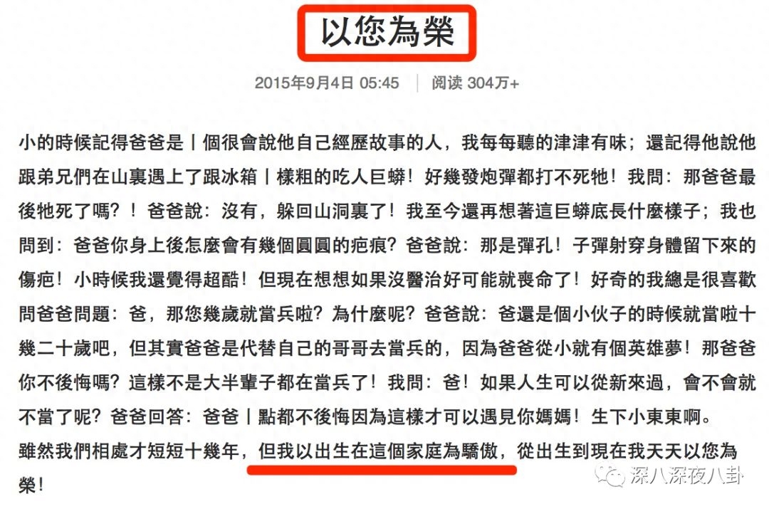 其实他爸爸是广东老兵,他在微博上回忆和爸爸对话也蛮感人的,【以出生在这个家庭为骄傲】
