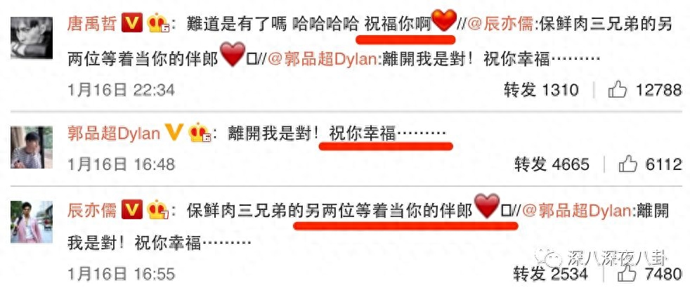 再加上这条博被好朋友郭品超唐禹哲,还有原队友辰亦儒转发,那么这段粉丝追到爱豆的神奇恋情估计是敲定了