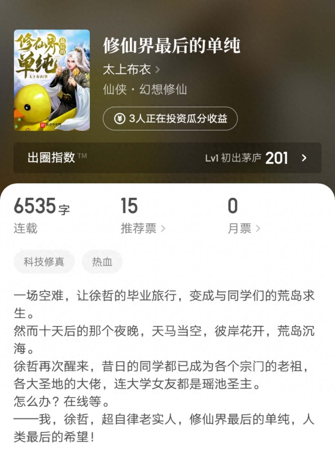 当然不管怎么样,如果你对太上布衣还有期待的话,那么可以去支持一下他的新作。也许这本新书的主角徐哲就会是下一个徐缺的。
