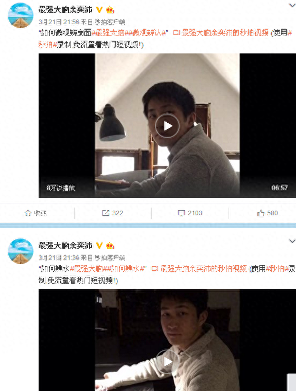 他发两个视频,主要的说明就是这两个项目并没有大家想象的那么难, ,要知道,水哥王昱珩,可是通过微观辨水,一战成名而闻名天下的,《最强大脑》的收视保证,也几乎是王昱珩在扛着。