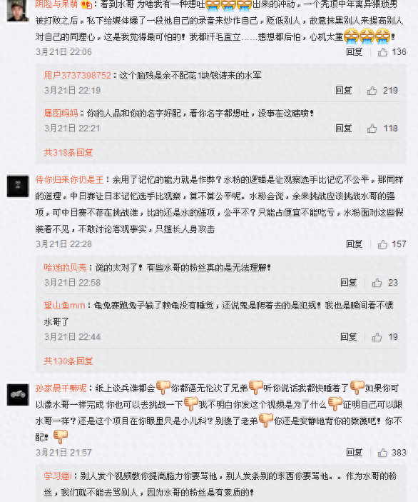 看过《最强大脑》的都知道,水哥王昱珩和选手余奕沛之间的事情。本来事情已经过去那么久,我们也不想再提了。不管他是不是黑幕,是不是作弊,是不是短跑冠军?事情过去了就让它过去了,没有必要再提起。但是有些人,却输人不输阵。 自己怎么赢的自己心里最清楚了。