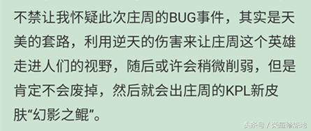 这位玩家是这么说的,利用庄周逆天的伤害让这个英雄进入玩家的视野,然后稍微削弱但不至于废掉,然后让庄周皮肤“幻影之鲲”进入玩家视野。这样来看,好像都已经印证了,修复bug后再增强确实削弱不至于废掉,韩信KPL皮肤逐梦之影的背景故事中也提到了幻影之鲲